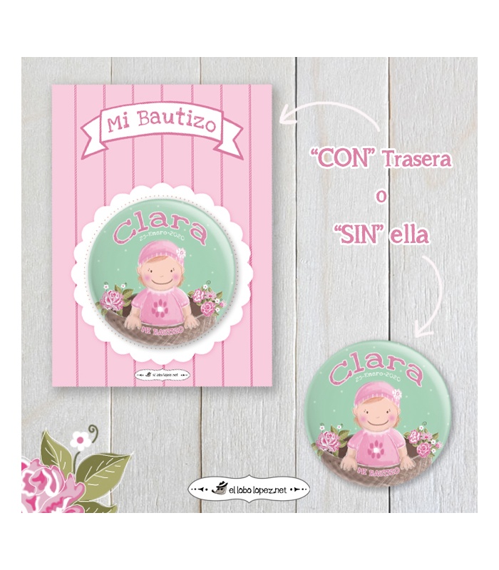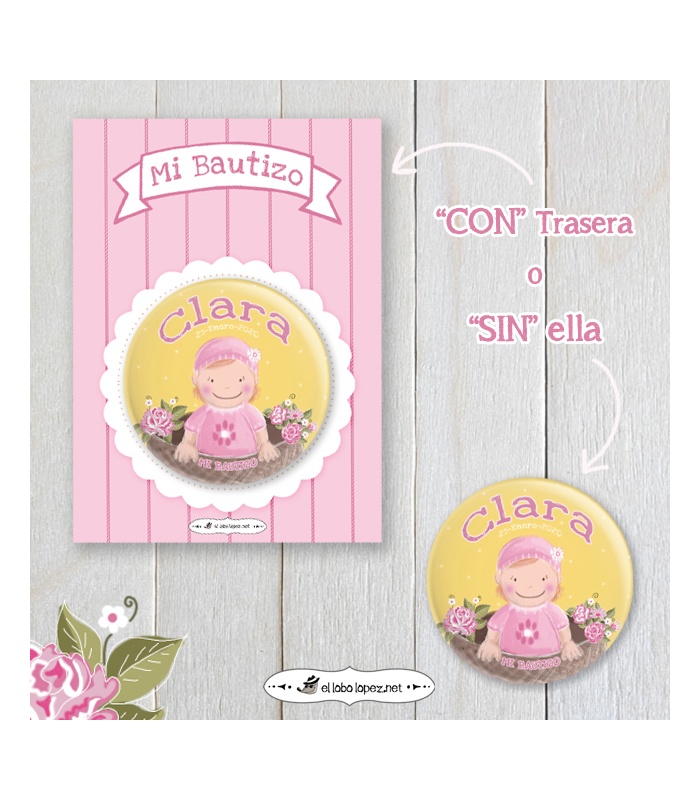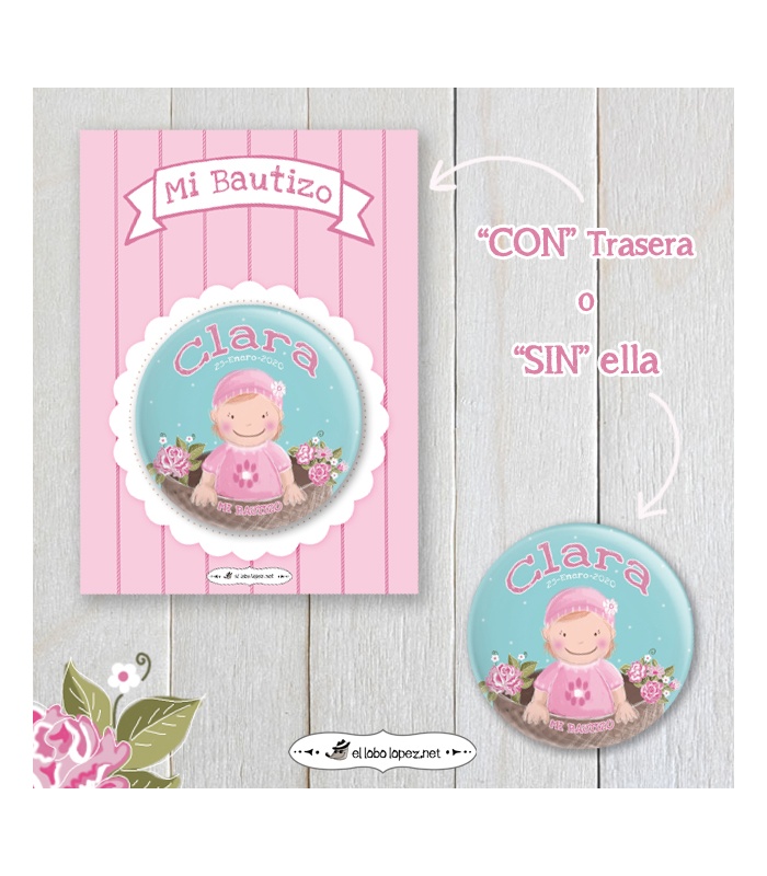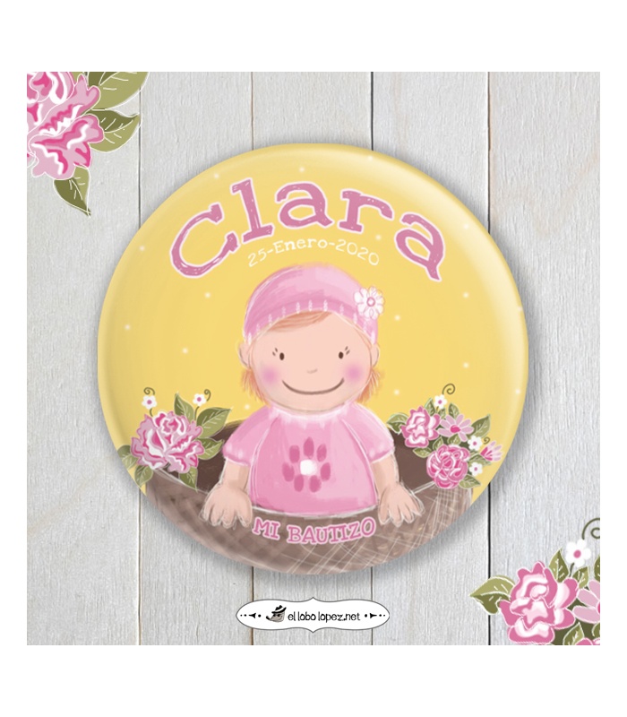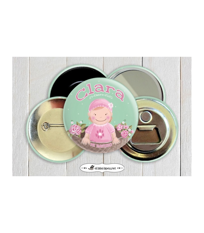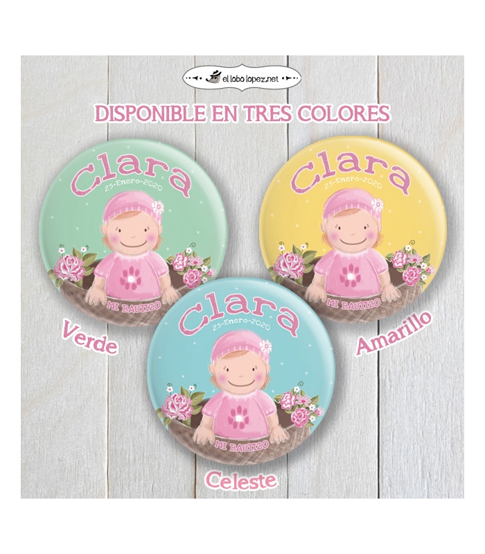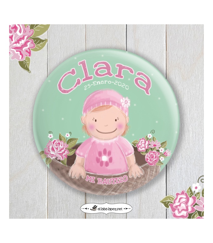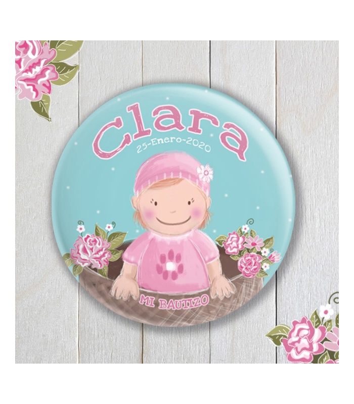Estas chapas serán el regalo perfecto para tener un bonito recuerdo del nacimiento de tu bebé! Como imán para nevera, espejito de bolsillo, etc...Personalizadas con el nombre de tu pequeña y la fecha de su bautizo.