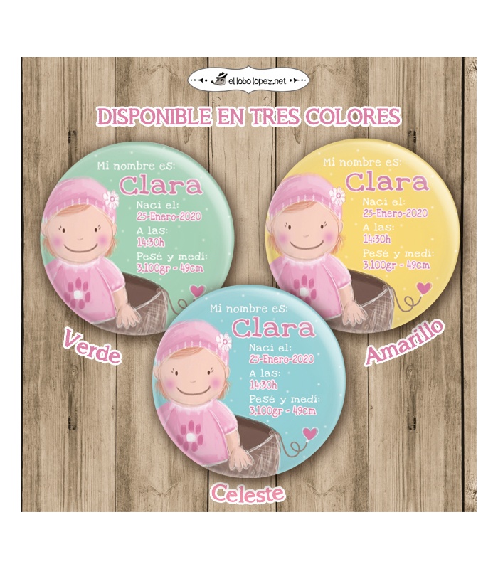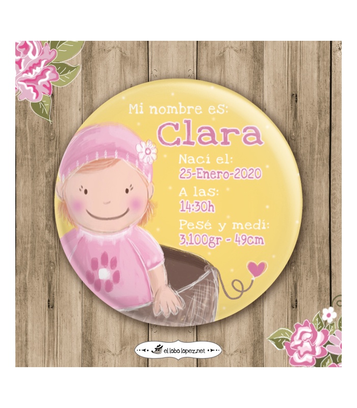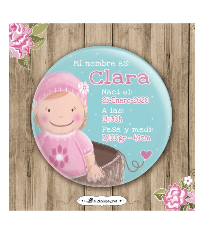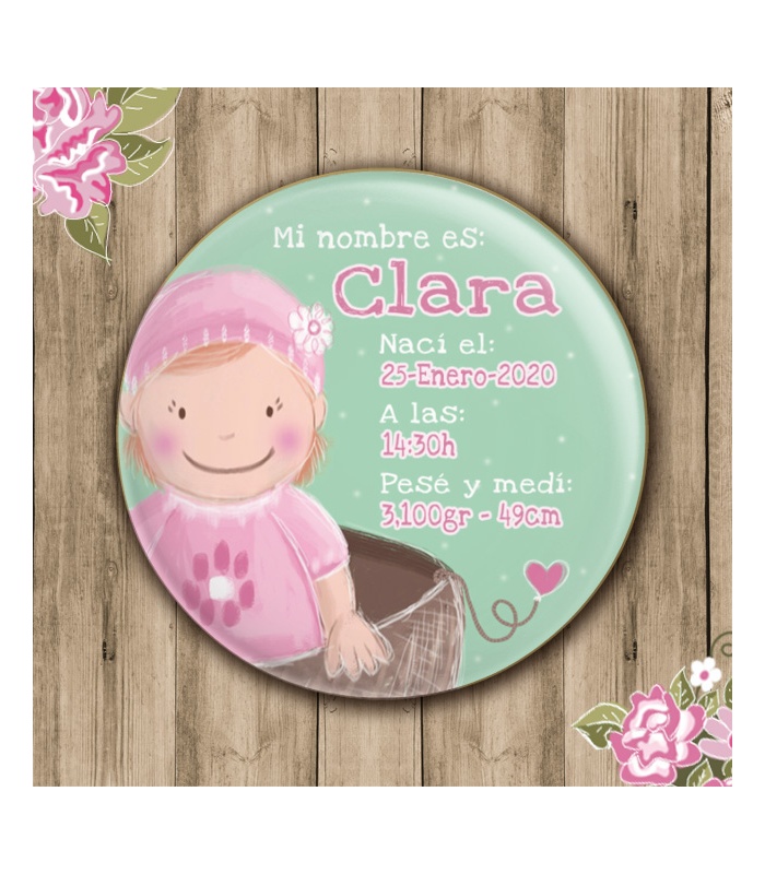 Chapa "NACIMIENTO BEBITA" Bautizo Ø 59mm y 75mm (Diseño by Arteneus).