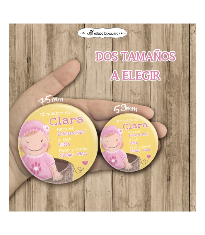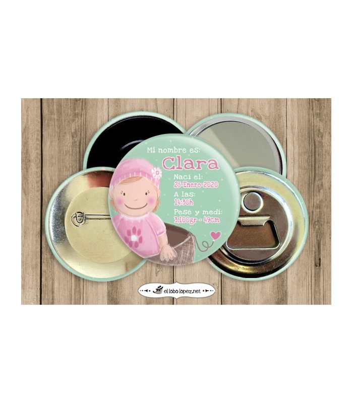 El detallito perfecto para regalar a famililares y amigos y que así recuerden esos momentos tan emotivos del nacimiento de vuestro bebé! Con diferentes traseras disponibles: Alfiler para la ropa, Espejito de bolsillo, Imán de nevera o Abrebotellas Magnético...
