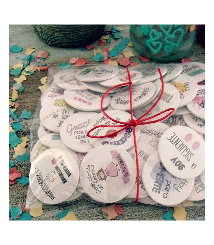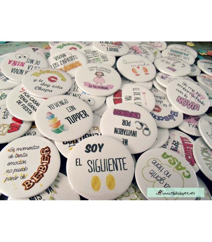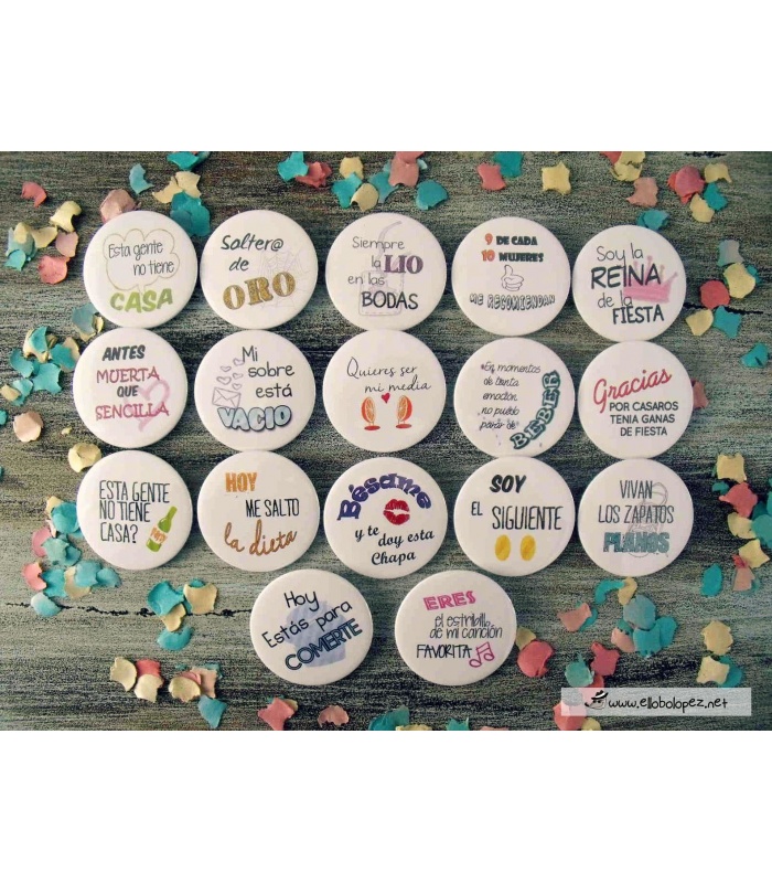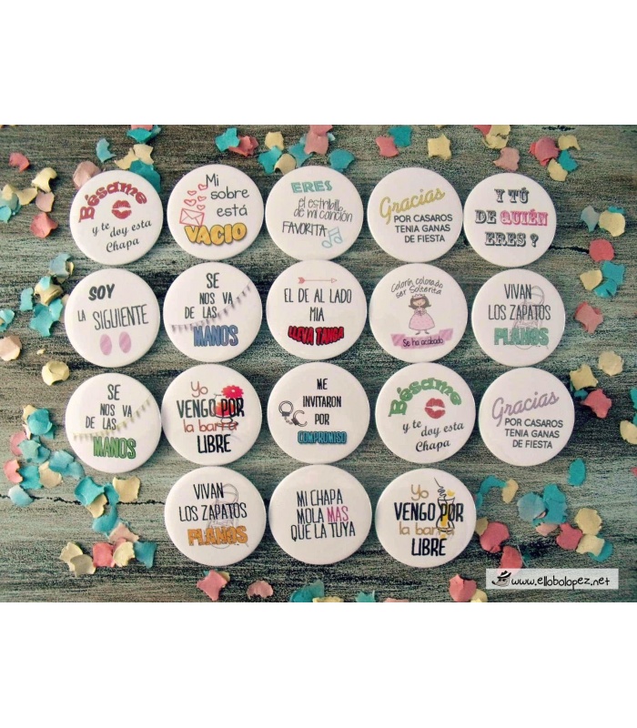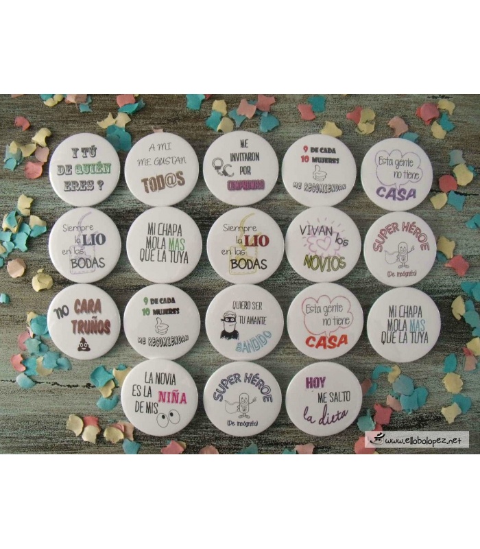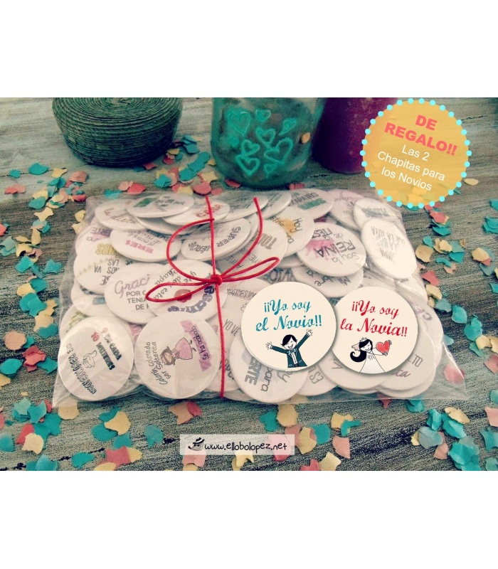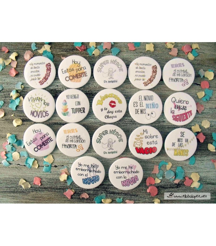 PACK 70 CHAPAS PARA BODAS 59mm "FRASES CON DIBUJOS DIVERTIDOS"