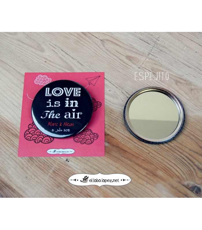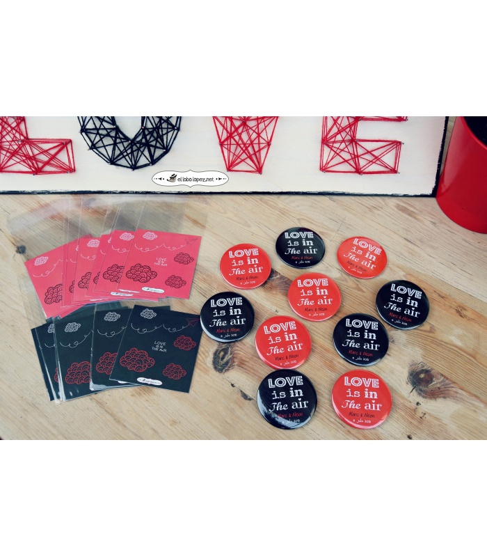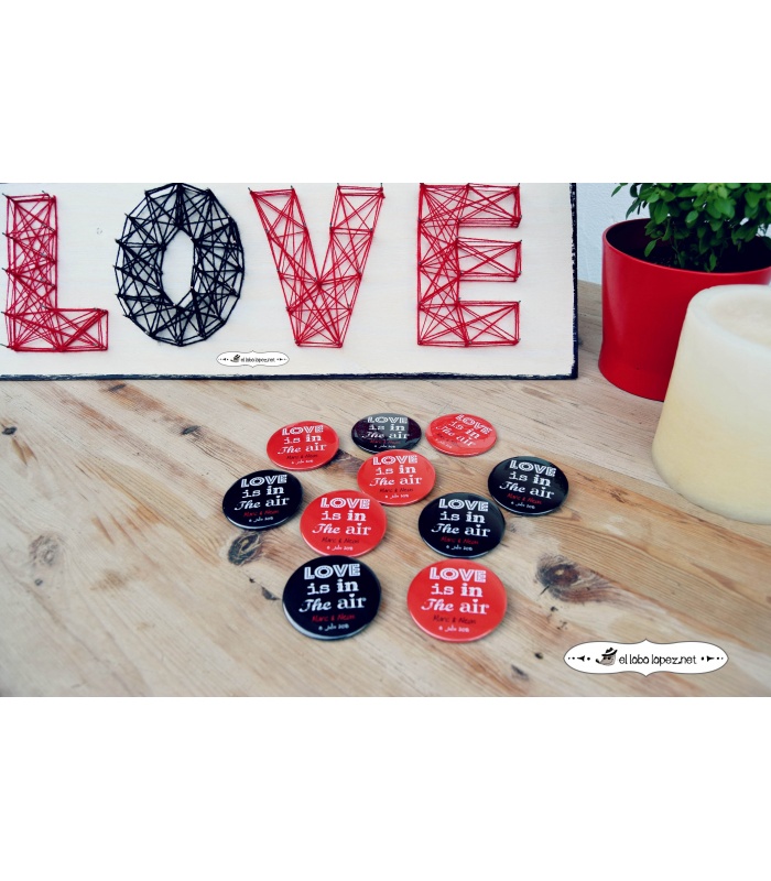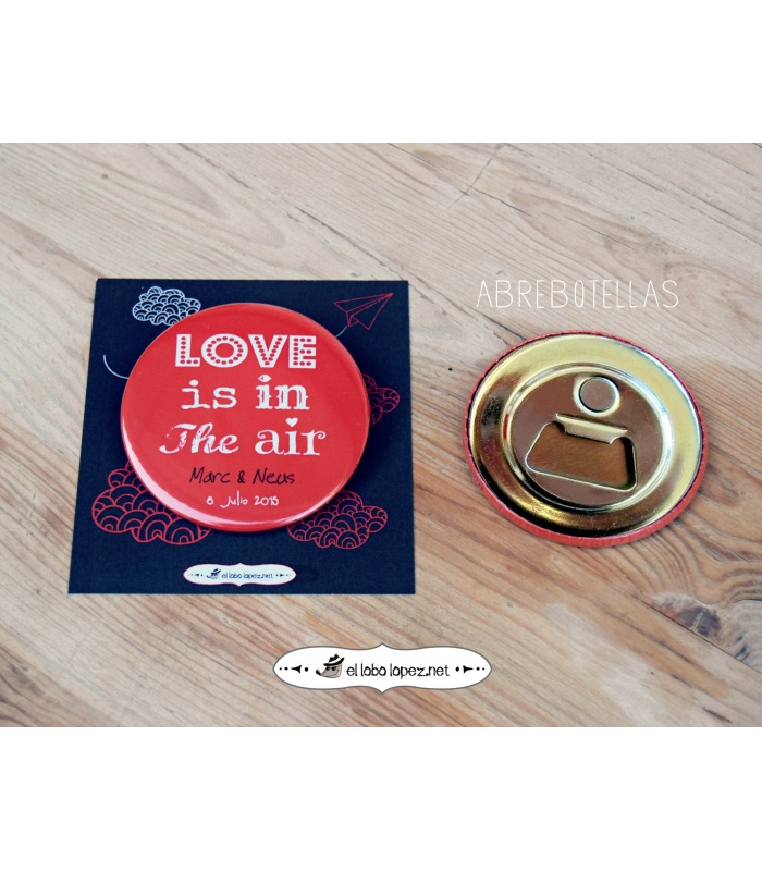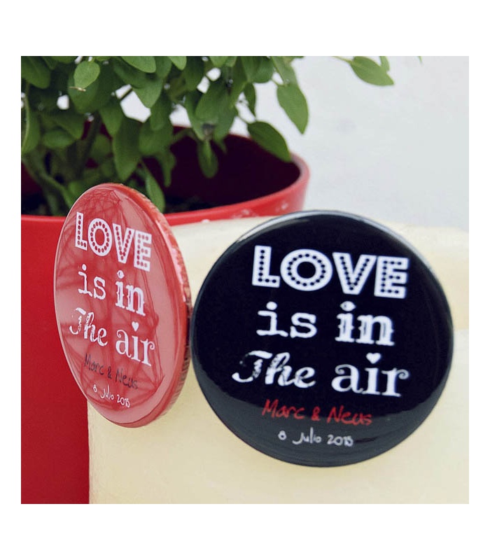 Personalizadas con los Nombres de la Pareja y la fecha de la Boda. Elige en el desplegable el Acabado: Alfiler, Imán, Abrebotellas o Espejo.