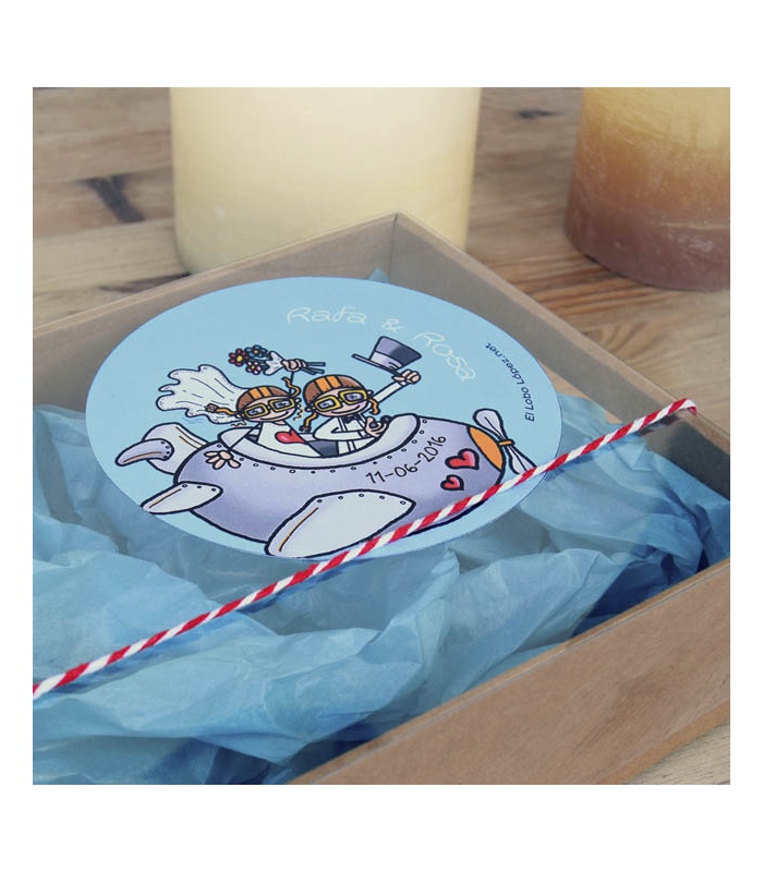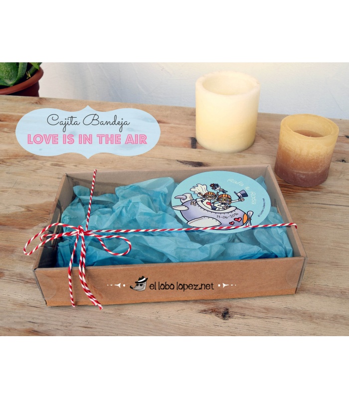 Caja-bandeja de cartón con tapa transparente. Diseño "Love is in the air" y personalizada con los nombres de la pareja y la fecha del enlace. (Chapas no incluidas).