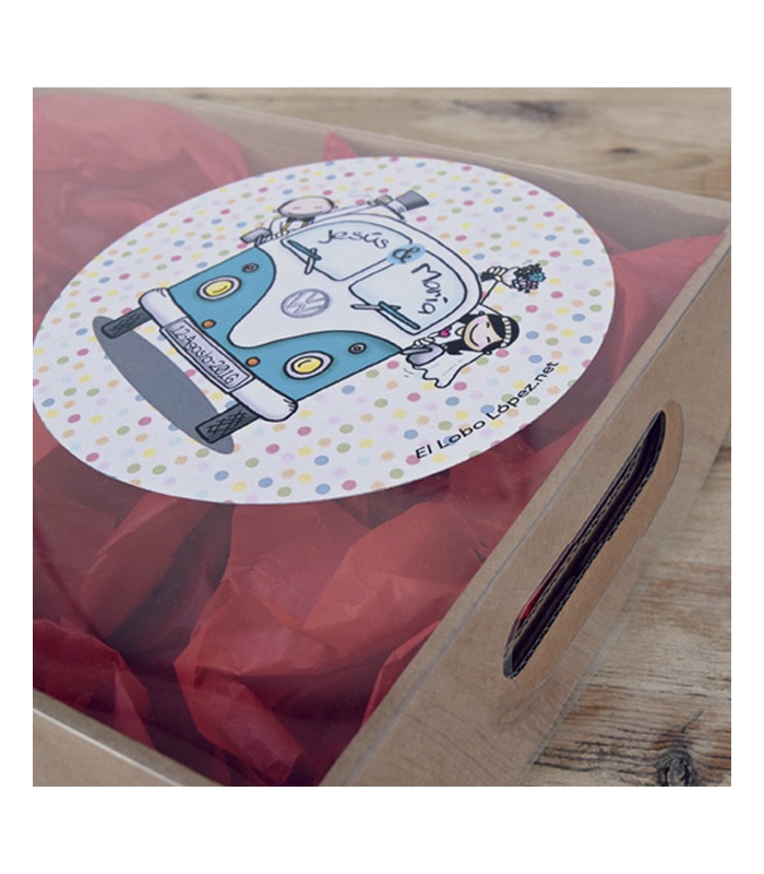 Caja-bandeja de cartón con tapa transparente. Diseño "Hippie Love" y personalizada con los nombres de la pareja y la fecha del enlace. (Chapas no incluidas).