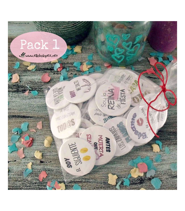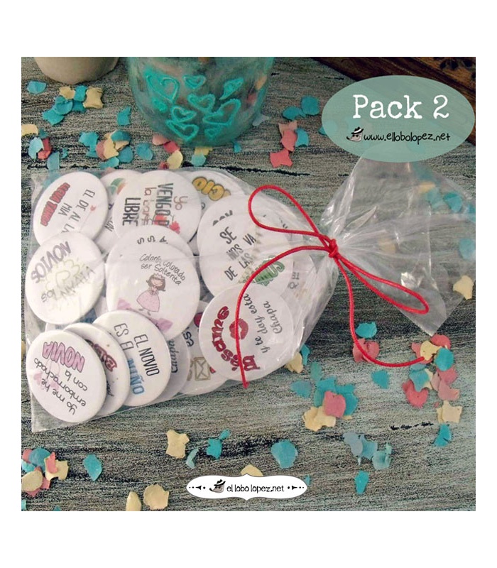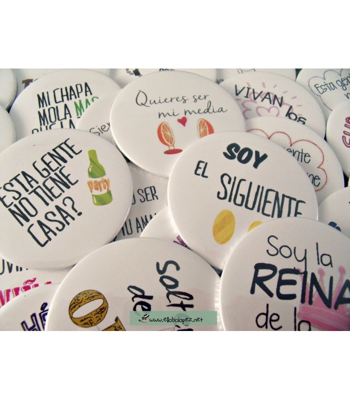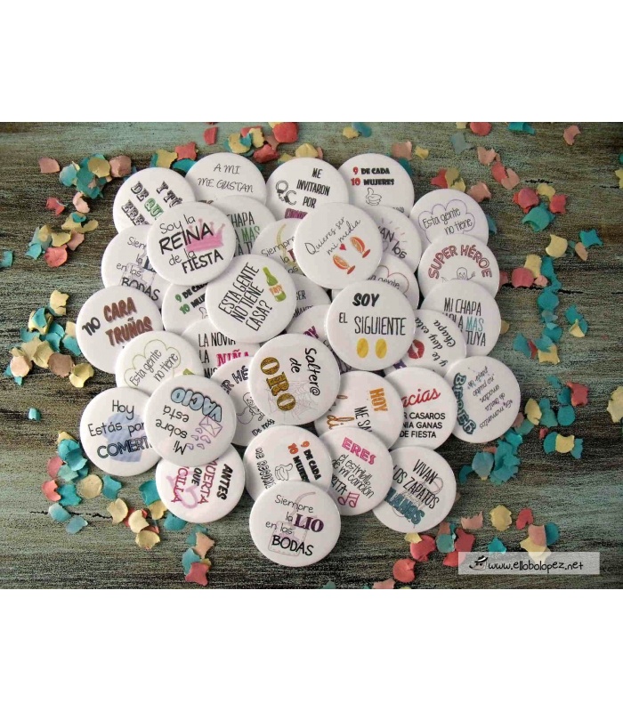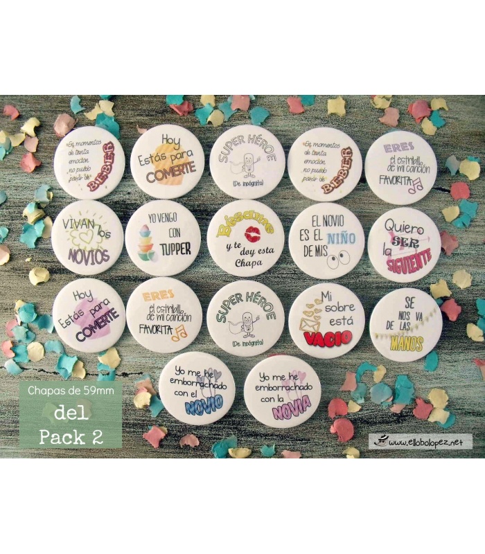 Pack Chapas para tu Boda compuesto por 35 Frases con Dibujos Simpáticos.