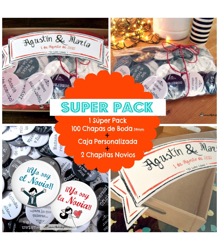 Súper Pack de 100 Chapas "Blanco&Negro" para Boda de 59mm(alfiler metálico), con 100 Frases Divertidas + 2 Chapas de la Pareja y Caja Especial de REGALO (Caja Personalizada con los nombres y Fecha de la Boda).