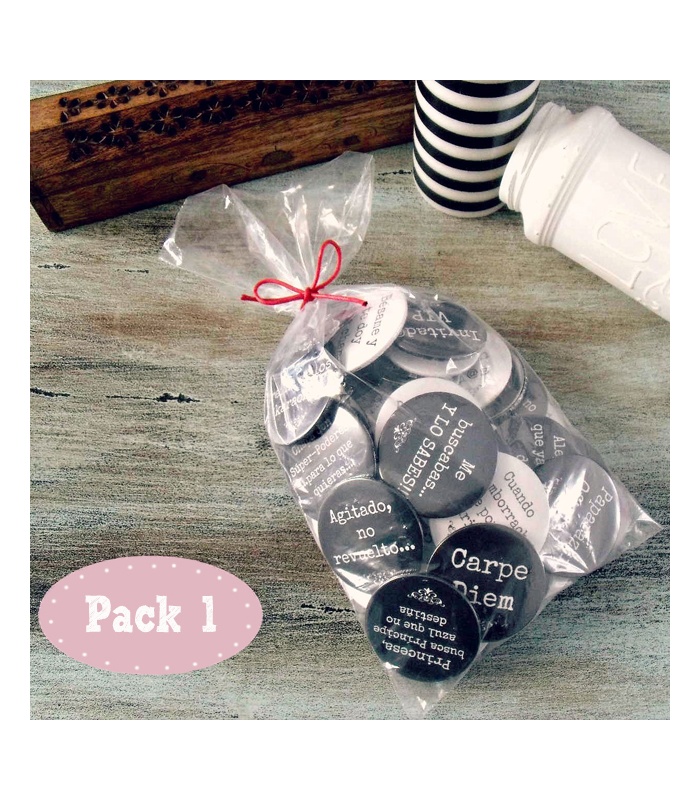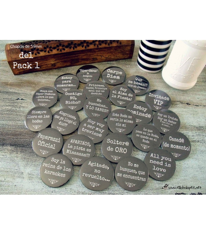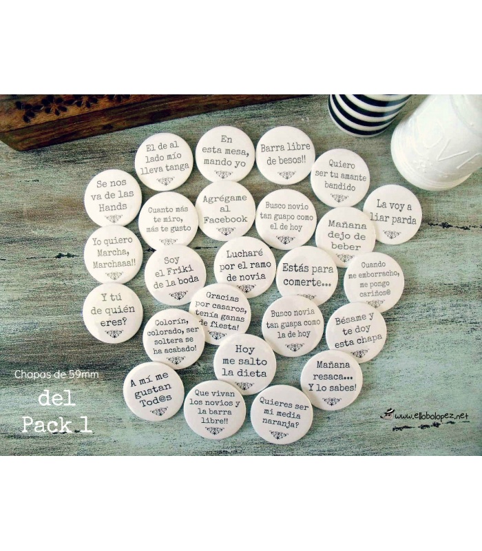 Pack de 50 Chapas para Boda de 59mm con 25 Frases en Blanco y 25 en Negro. Pinchando en las imágenes puedes descubrir cada una de las chapas con cada frase diferente.