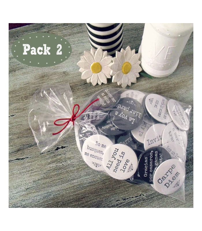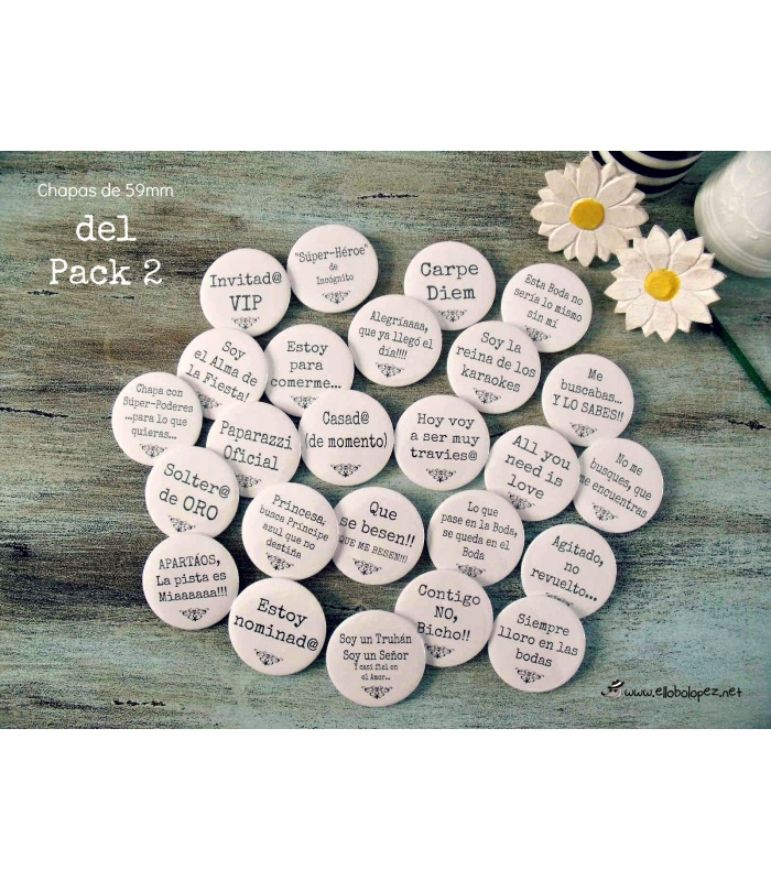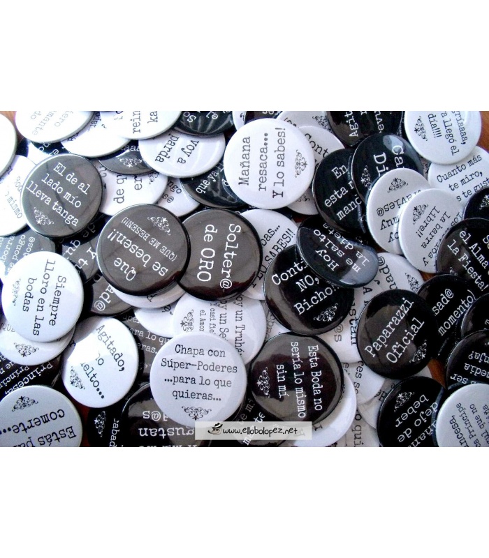 Pack de 50 Chapas para Boda de 59mm con 25 Frases en Blanco y 25 en Negro. Pinchando en las imágenes puedes descubrir cada una de las chapas con cada frase diferente.