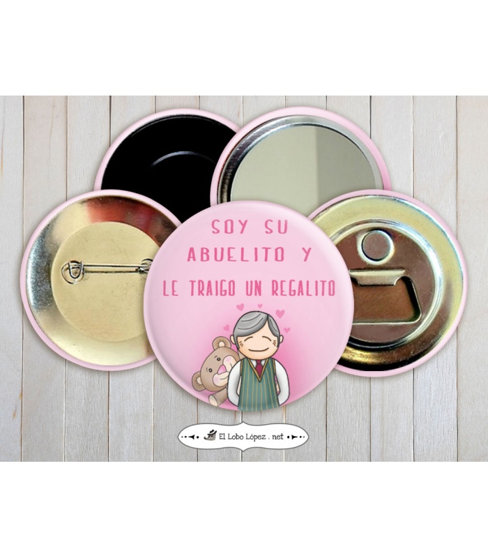 Con diferentes traseras disponibles: Abrebotellas magnético, Alfiler, Imán de nevera, etc.