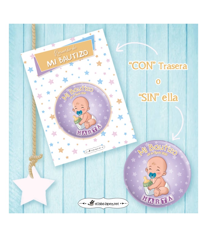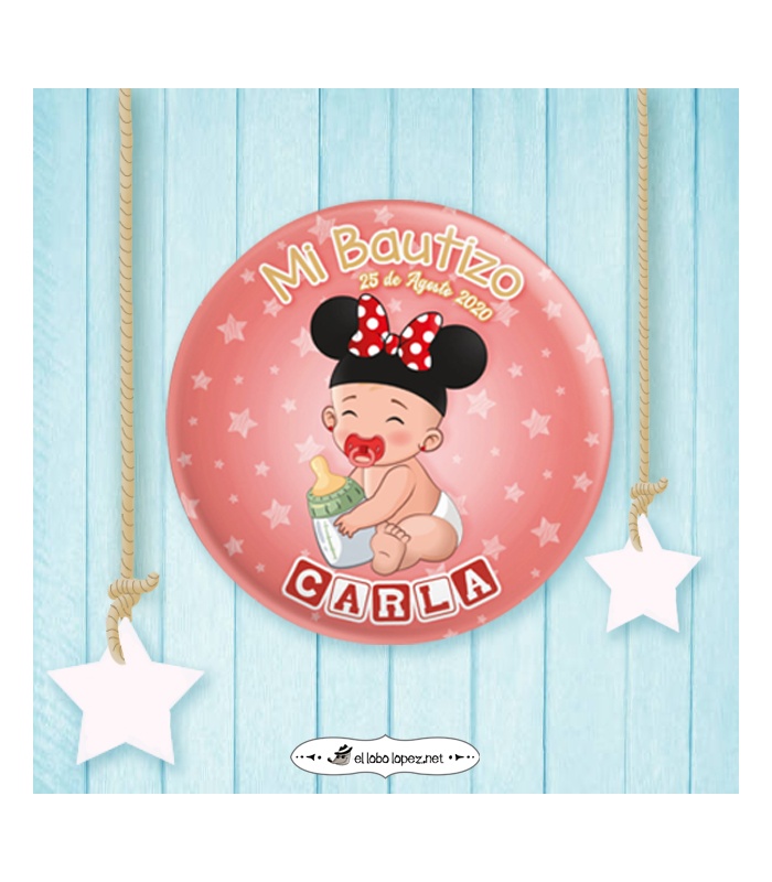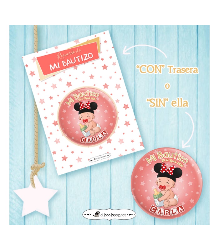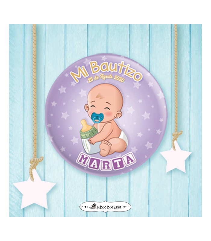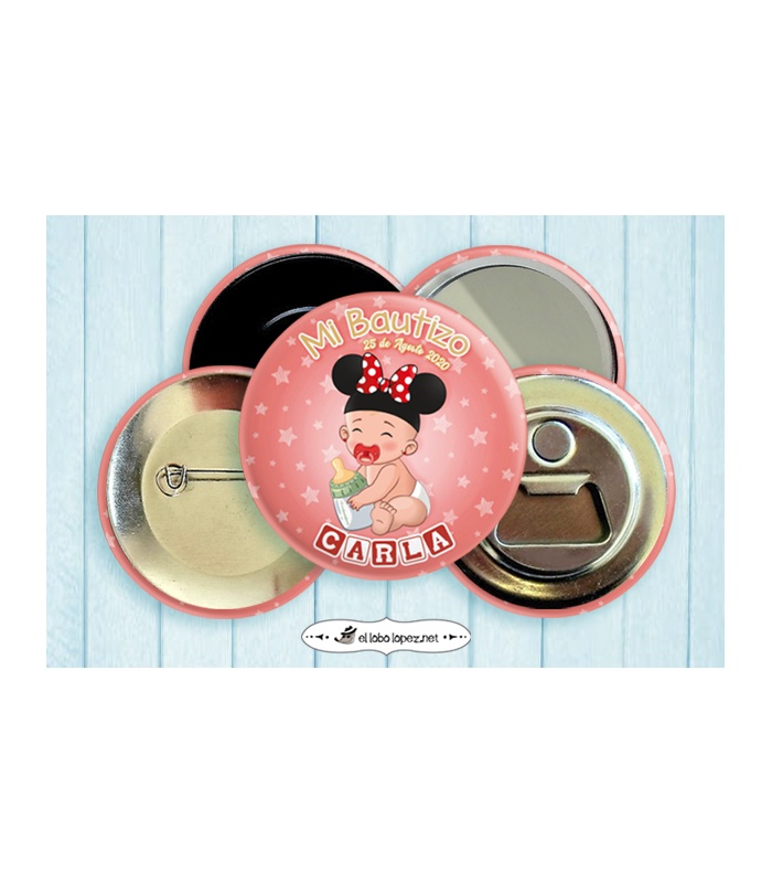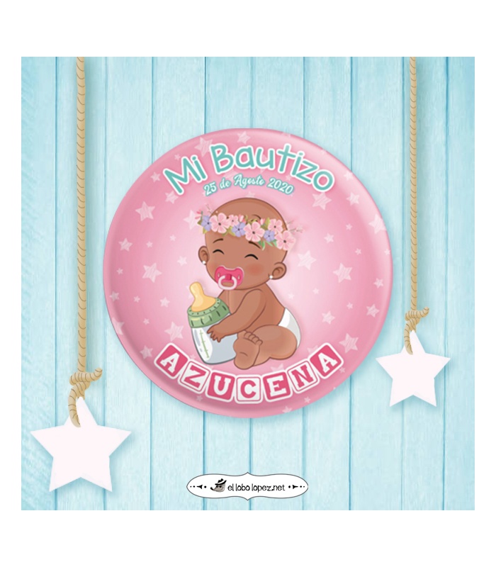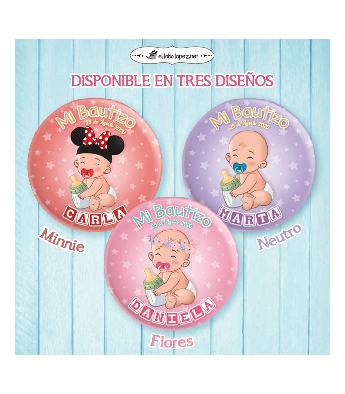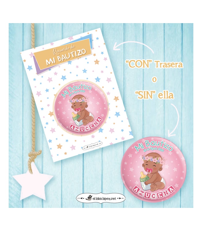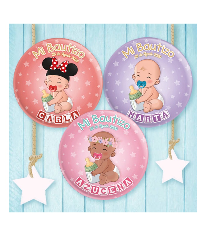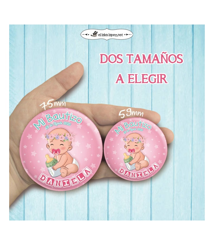 Estas chapas serán el regalo perfecto para tener un bonito recuerdo del nacimiento de tu bebé! Como imán para nevera, espejito de bolsillo, etc...Personalizadas con el nombre de tu pequeña y la fecha de su bautizo.