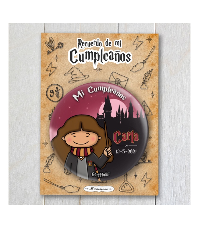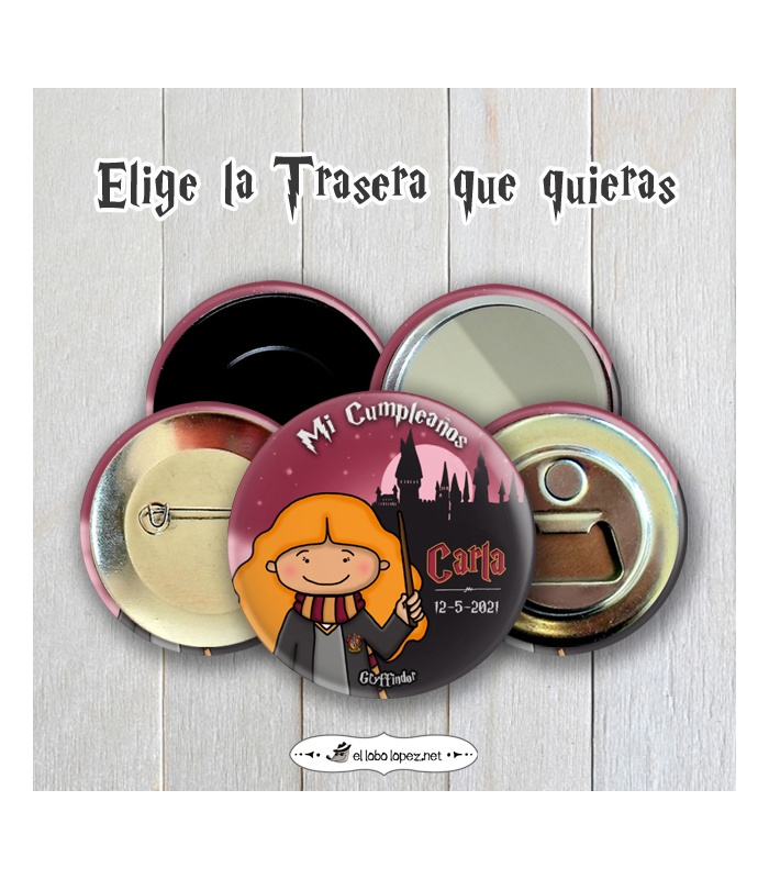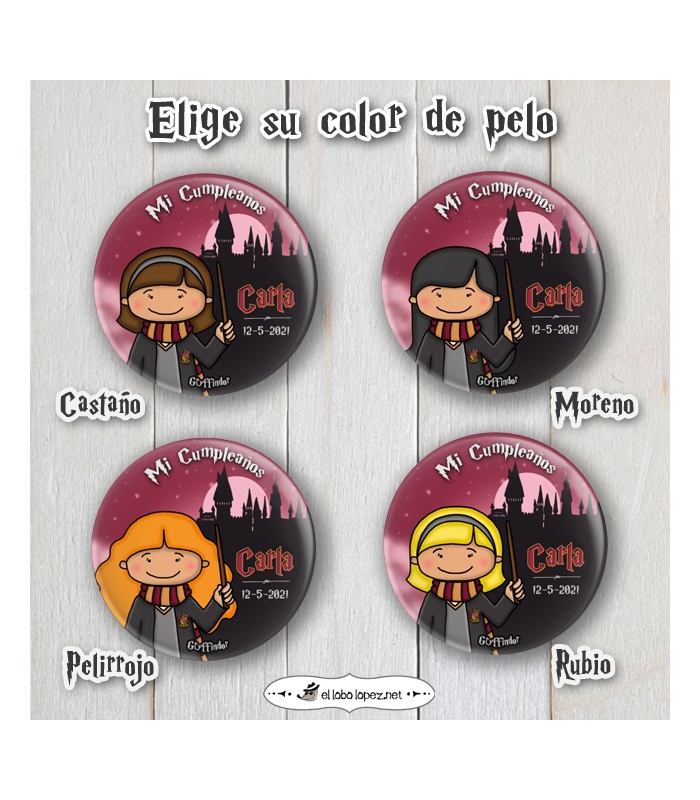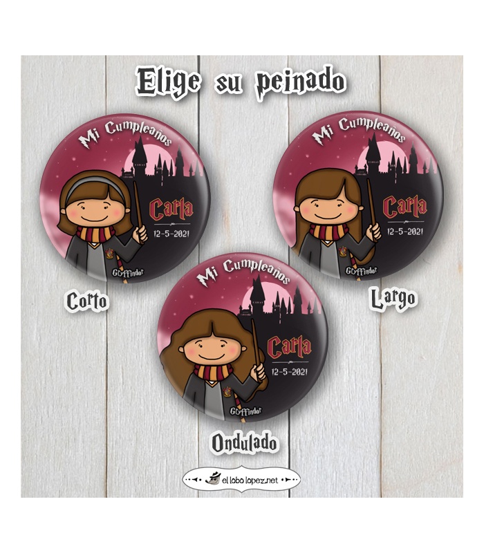 Si eres Fan Harry Potter o tu hija, amiga, sobrina, estas son las Chapas perfectas para vuestro Cumpleaños! Personalizadas con nombre, fecha, peinado y color de pelo. Decide si la prefieres con la "Tarjeta-Recordatorio" y Elige el acabado y tamaño en los desplegables.