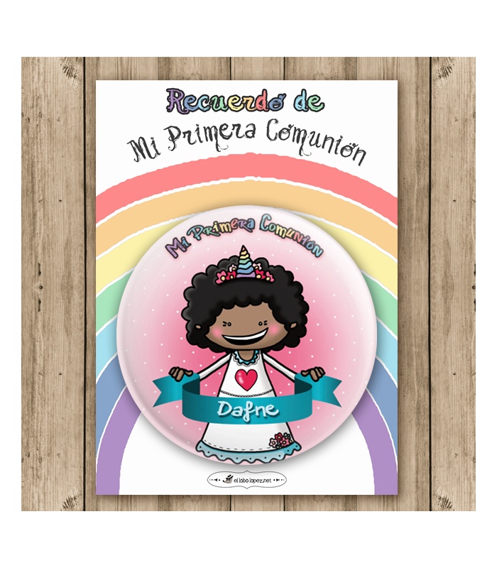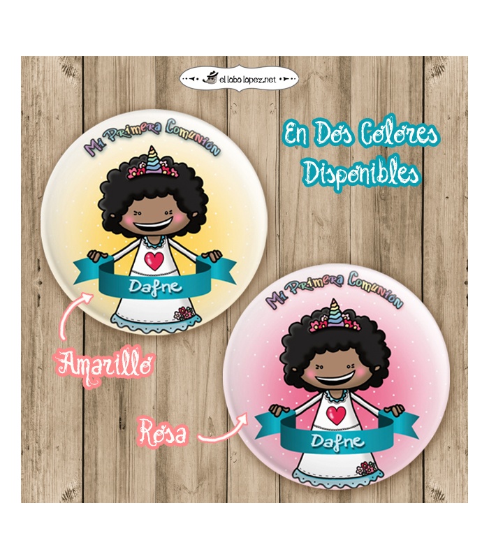 Chapa Comunión "NIÑA UNICORNIO"(pelo afro) 59mm y 75mm. Diseño by Arteneus
