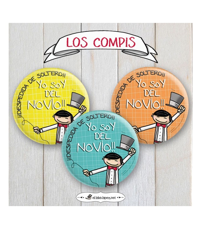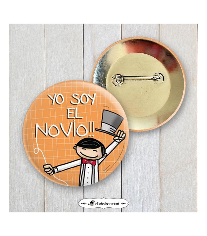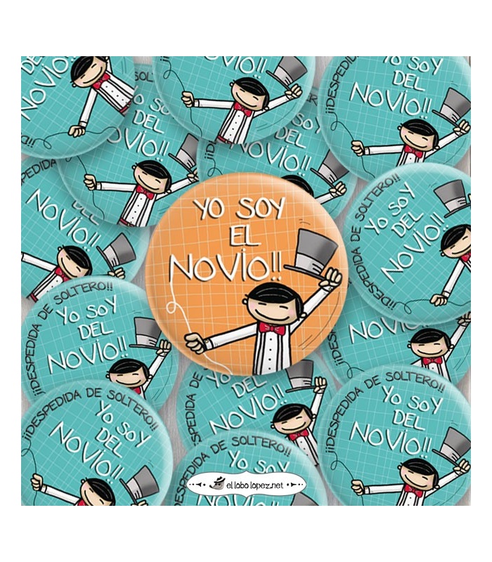 Chapas Despedidas "YO SOY DEL NOVIO". Metálica con Alfiler de / Ø 59 mm o 75mm.