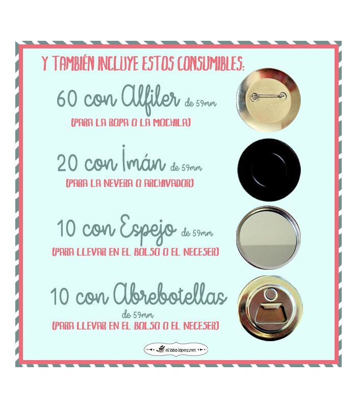 - 20 consumibles para hacer chapas de Imán de 59mm (para pegar en la nevera o en objetos metálicos).