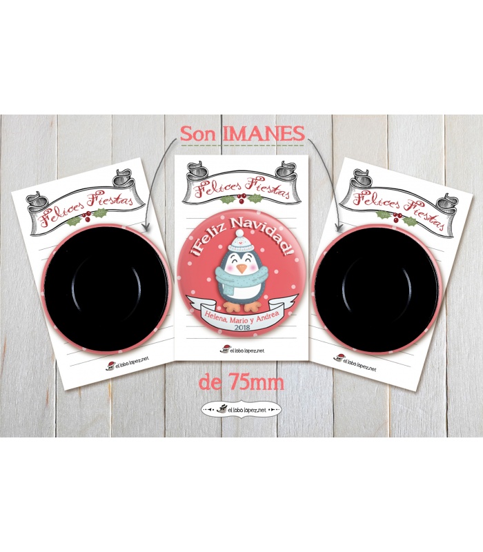 NAVI-IMANES (Pinguino) Chapas Navideñas de 75mm, con trasera de imán, tarjetita y bolsita. Diseño by Arteneus.