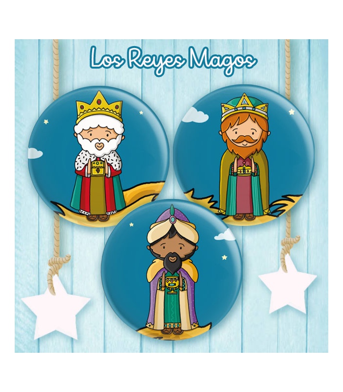 En el producto van incluídos los tres Reyes Magos, en chapas de imán de 59mm de diámetro.