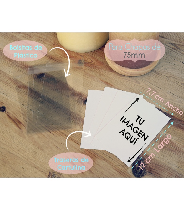 - El Packaging de 75mm contiene: 1 Bolsita de Plástico con cierre adhesivo y 1 Trasera de Cartulina de: 7,7 cm de Ancho y 12 cm de largo, donde irá tu imagen impresa.