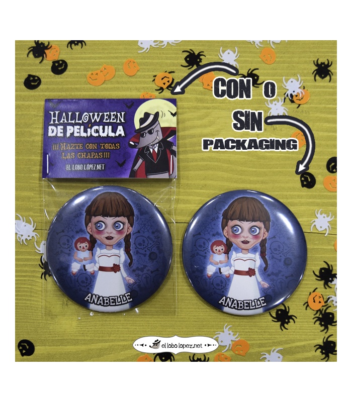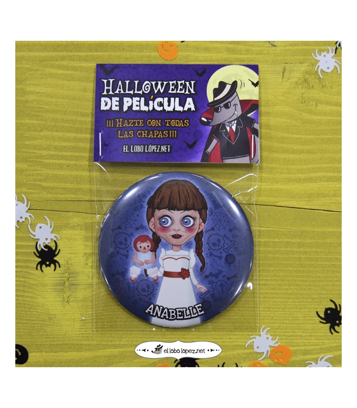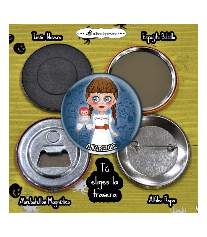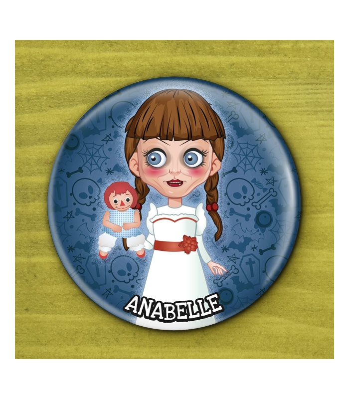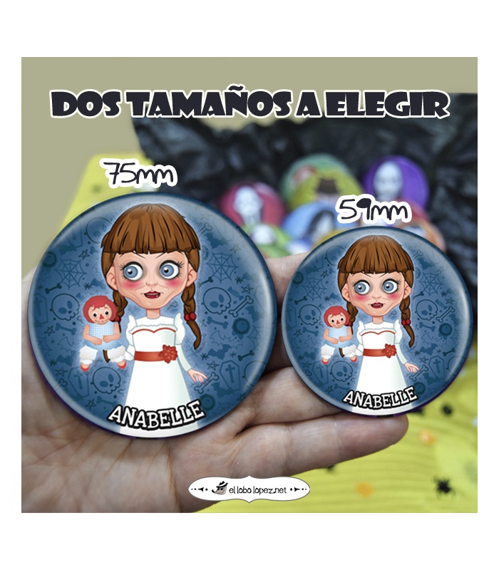 Chapa Halloween de "ANABEL" en Ø 59mm ó 75mm de diámetro. Diseño by Selu Vargas.