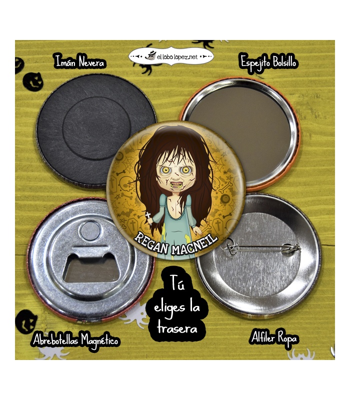 Puedes elegir la terminación que quieras: En alfiler para la ropa, imán para nevera, espejo de bolsillo o abrebotellas magnético)...