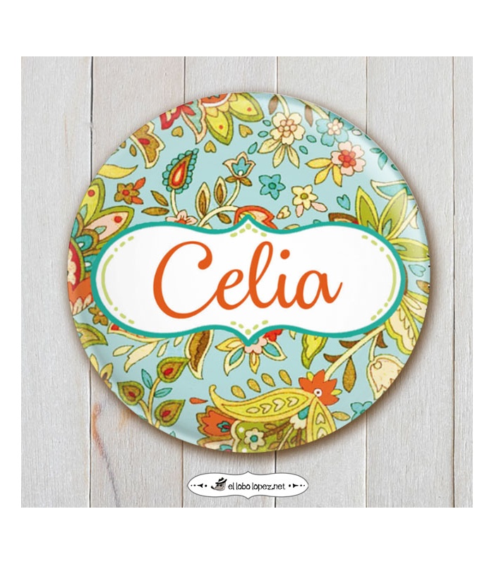 CHAPA CON NOMBRE "FLORES HIPPIES" en 59mm y 75mm.