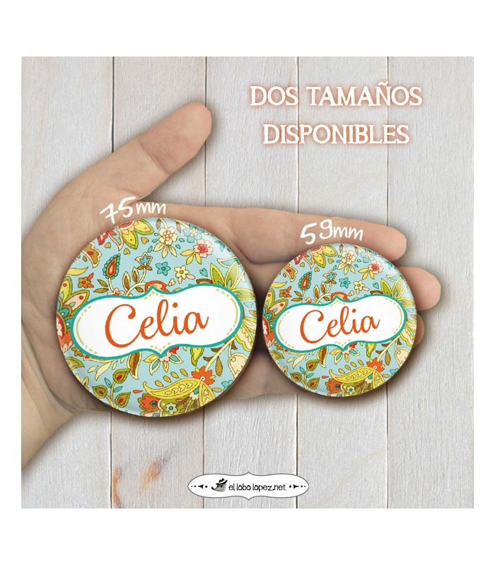 CHAPA CON NOMBRES "FLORES HIPPIES" en 59mm y 75mm.