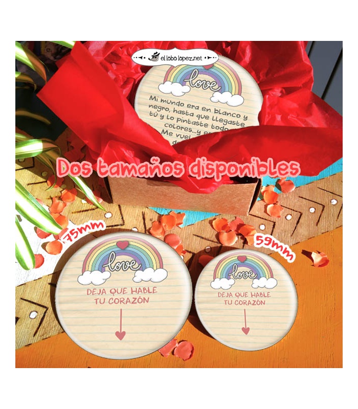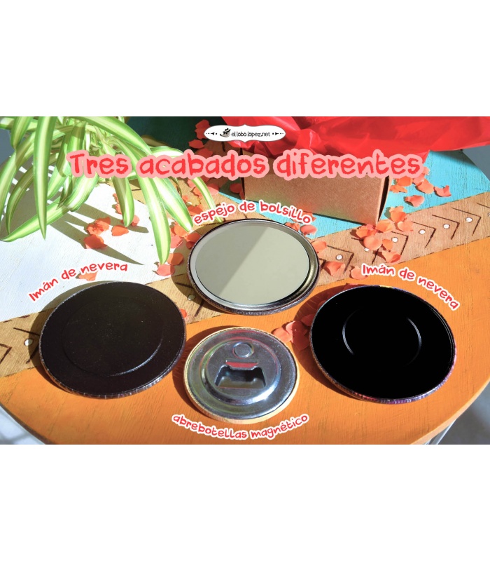 Disponible en dos tamaños: 59mm y 75mm de diámetro. Y con diferentes traseras(imán de nevera, espejito de bolsillo o abrebtellas magnético).Tan sólo tienes que elegir el tamaño y la trasera que deseas en los desplegables.