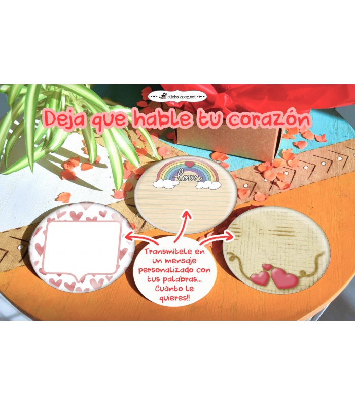 Elige el diseño que más te guste (de los 3 que hay disponibles) y personaliza el texto con las palabras que salgan de tu corazón.(máximo 90 caracteres)