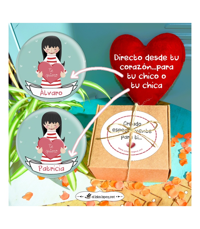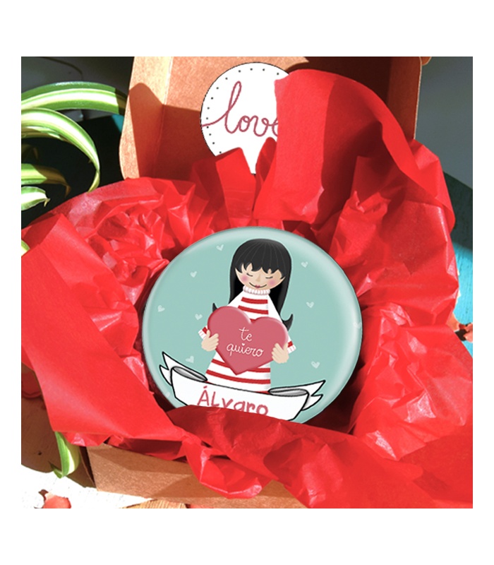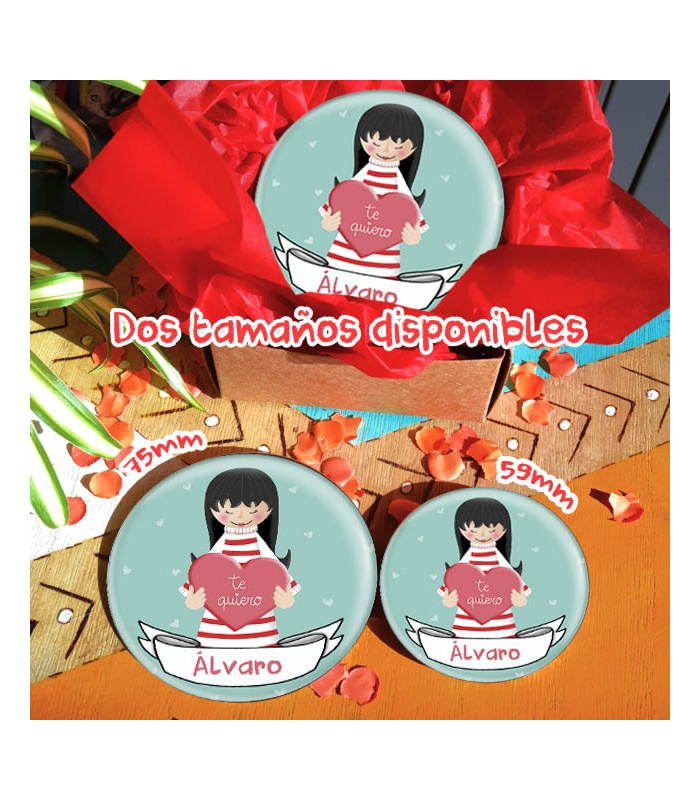Chapa Regalo "TE QUIERO" con nombre (chica) Ø 59mm y 75mm (Diseño by Arteneus).